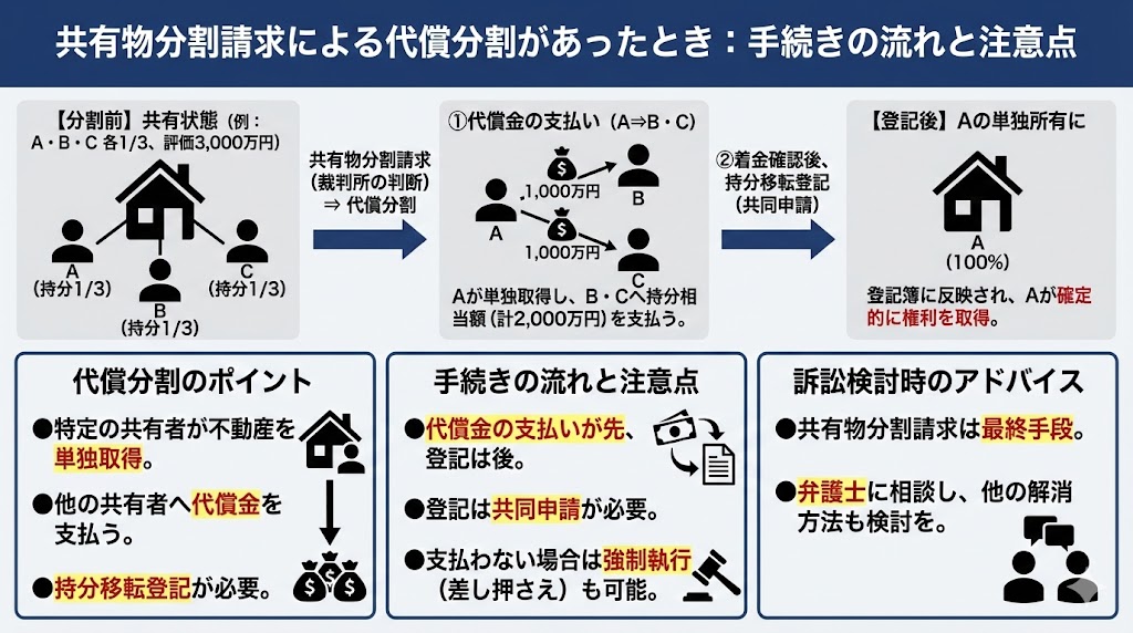代償分割では、まず代償金の支払いが先に行われ、着金が確認できた段階で登記の手続きを進める流れが基本となります。裁判所での判決を受けた後、相手が代償金を支払わない場合には、強制執行による財産の差し押さえが可能です。