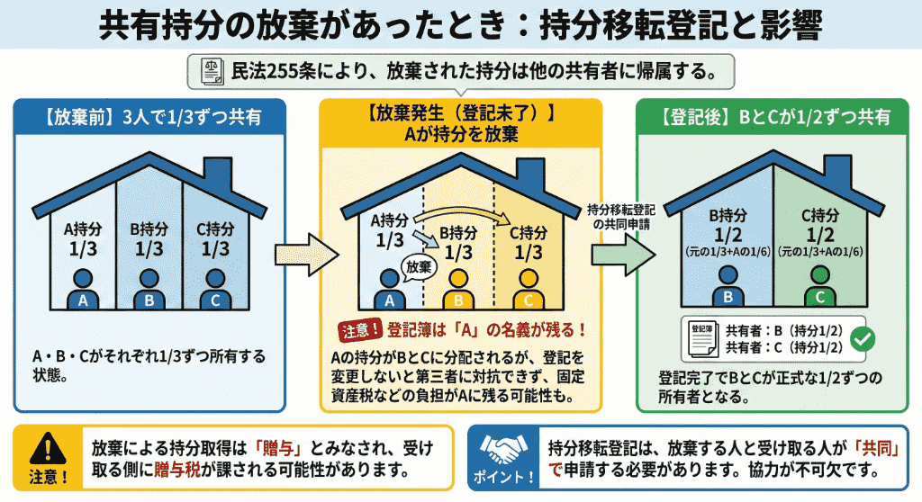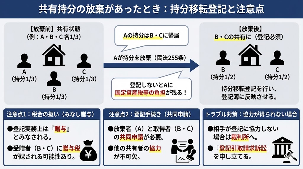放棄された持分を取得する場合、法律上は「放棄による帰属」となりますが、登記手続きにおいては「他の共有者から持分の贈与を受けた」とみなされます。そのため、放棄された持分を受け取る側には、贈与税が課される可能性がある点に注意が必要です。
