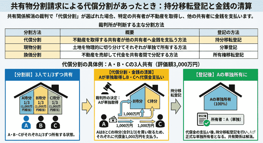 | 代償分割 | 不動産を取得する共有者が他の共有者へ金銭を支払う方法 | 持分移転登記 |