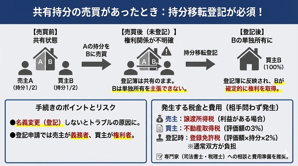 共有不動産に関する権利を適切に行使するためには、実際の所有者と登記上の名義人が一致していることが前提となります。融資や売却、賃貸収益の受け取りをスムーズに行うためにも、持分を取得したら早めに移転登記を済ませておきましょう。