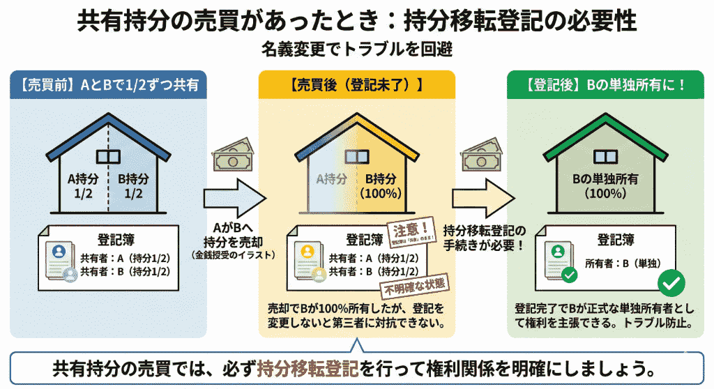 この場合、売却によってBが不動産の100%を所有することになりますが、登記簿を変更しなければAとBの共有状態のままです。買主であるBが単独所有者として権利を主張するためにも、持分移転登記の手続きが必要になります。