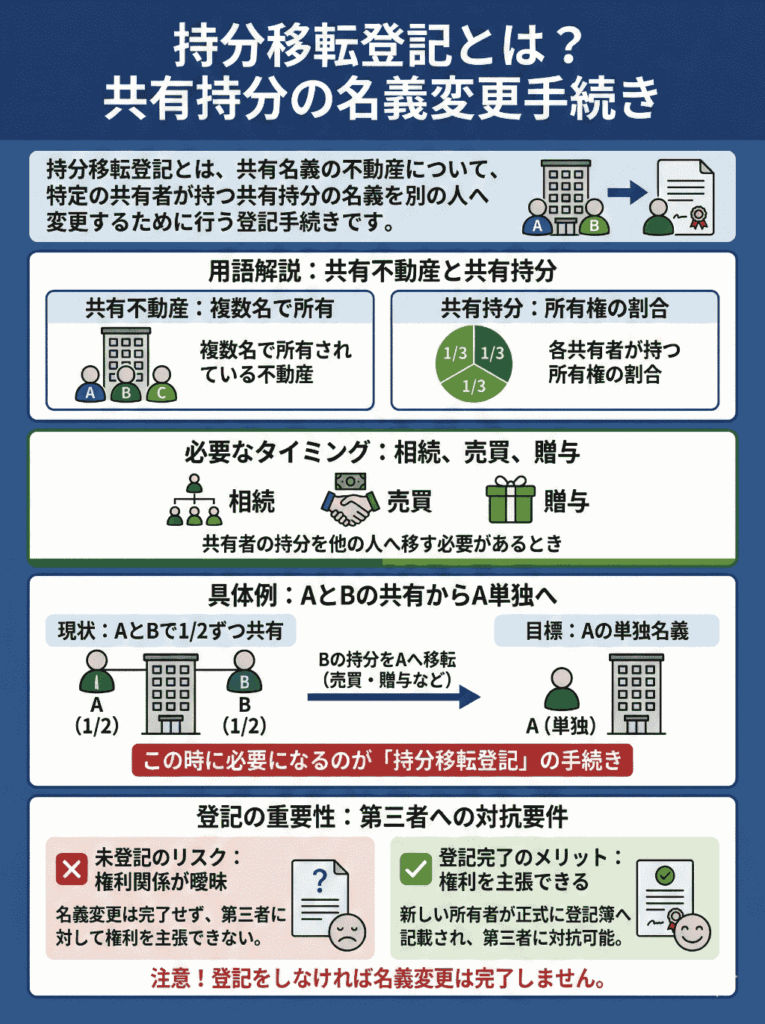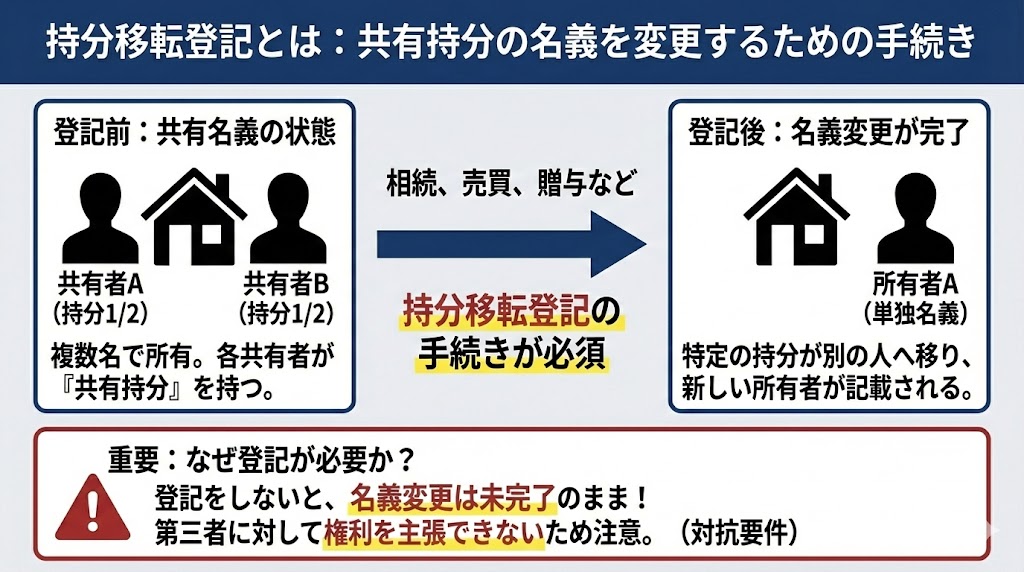 持分移転登記は、共有不動産の持分が他の人に移ったときに、その内容を法務局の登記簿へ反映させる手続きです。