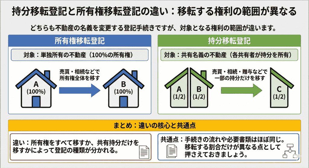持分移転登記と所有権移転登記は、いずれも不動産の名義を変更するための登記手続きですが、移転する権利の範囲が異なります。