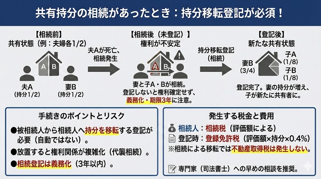 共有名義の不動産を所有している共有者が亡くなると、その人が持っていた共有持分は相続財産として相続人へ引き継がれます。相続によって持分の所有者が変わるため、誰が新しい所有者になるのかを登記簿へ反映させるために持分移転登記が必要です。