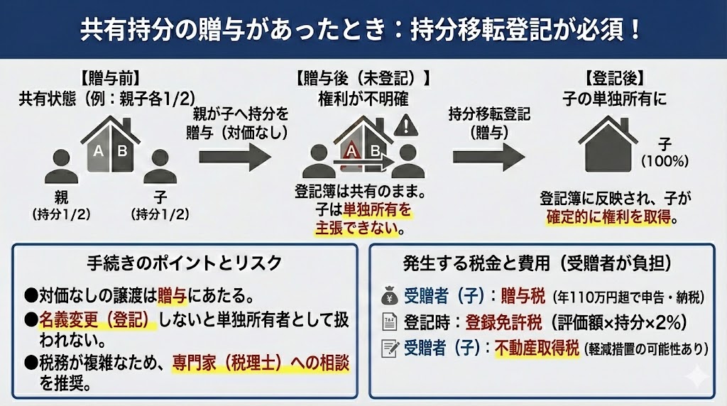 贈与が成立すると、親の持分2分の1が子どもへ移るため、子どもは不動産を単独で所有することになります。しかし、贈与の事実を登記簿に反映させなければ、名義上は親子の共有状態のままで、子どもが単独所有者として扱われません。