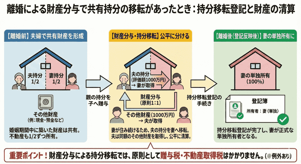 財産分与で持分を移す場合、贈与税や不動産取得税などの税金は発生しません。財産分与は夫婦の共有財産を分けるための手続きであり、贈与とはみなされないためです。