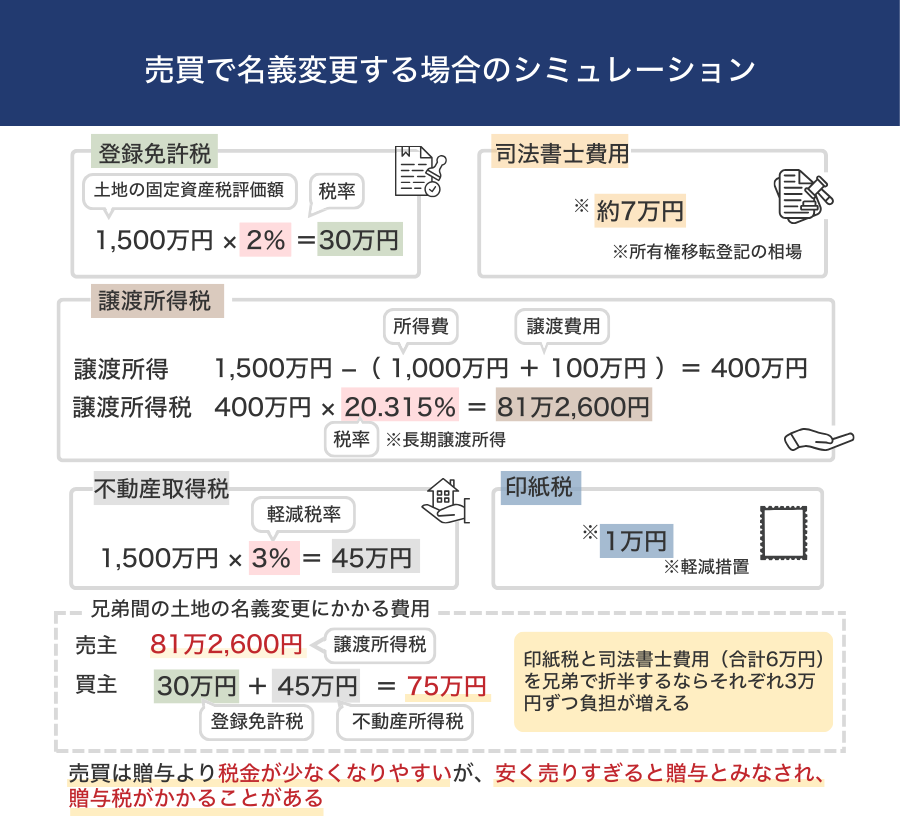 この場合、土地の売主である兄が負担する税金は81万2,600円(譲渡所得税)、買主である弟が負担する税金は合計75万円(登録免許税+不動産取得税)となります。印紙税と司法書士費用(合計6万円)を兄弟で折半するのならそれぞれ3万円ずつ負担が増えます。
