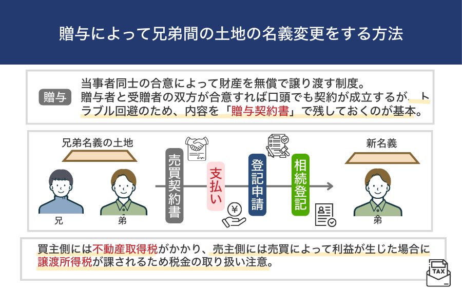 無償で土地を譲り受けるのであれば贈与、金銭の支払いをするのであれば売買となり、どちらを選ぶかは兄弟間の合意内容や税務面の扱いによって判断します。