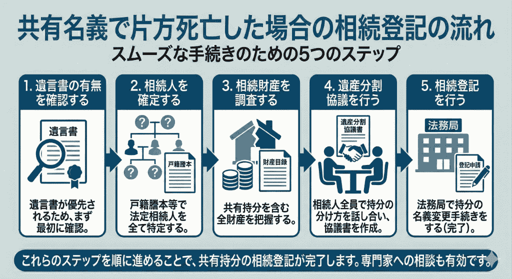 共有名義の片方が死亡した際の相続登記は、以下の流れが基本となります。