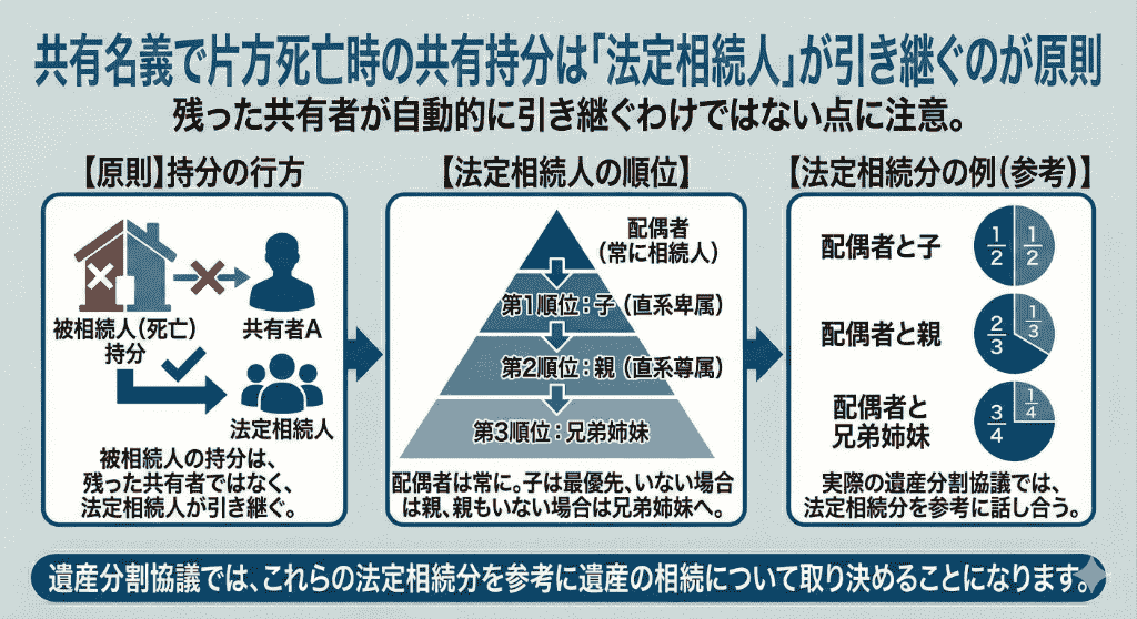 共有名義の片方が死亡した場合、法定相続人が持分を引き継ぐことになるのが原則であり、遺産の相続割合は法定相続分を参考にするという点を押さえておきましょう。