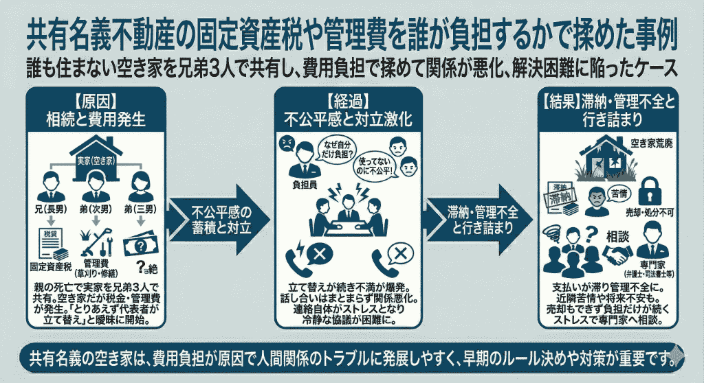 相続後の費用負担をめぐって対立が生じ、共有名義不動産の維持管理が困難になった事例です。