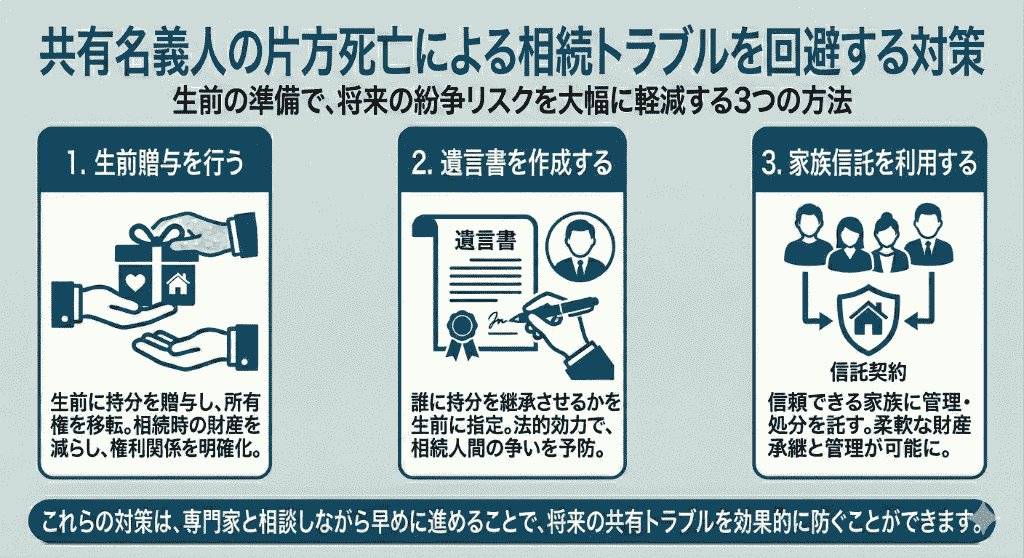 共有名義の不動産で片方が死亡した場合に、相続トラブルを回避するための対策は以下のとおりです。