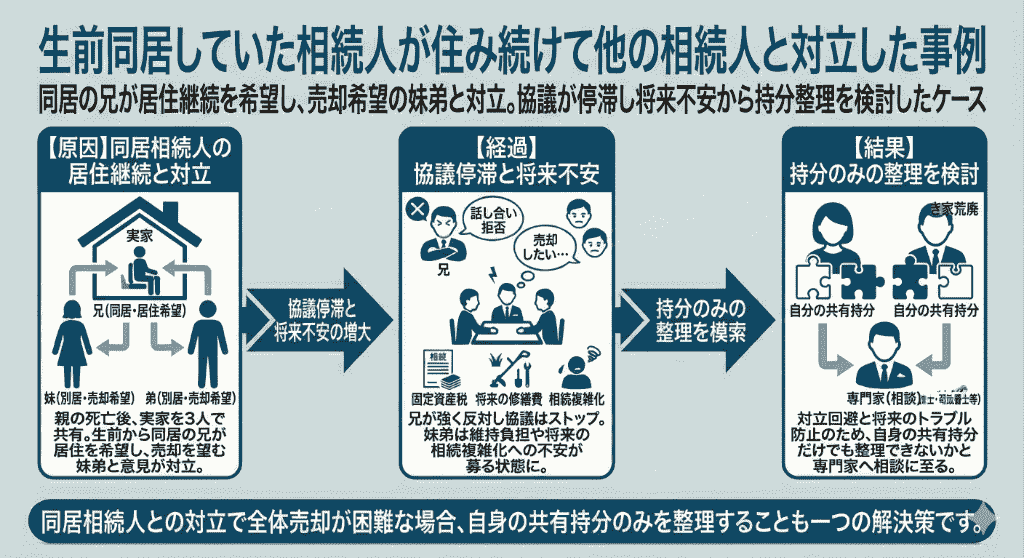 生前に同居していた相続人がそのまま住み続けたことで、共有名義不動産の扱いをめぐって意見が対立した事例です。