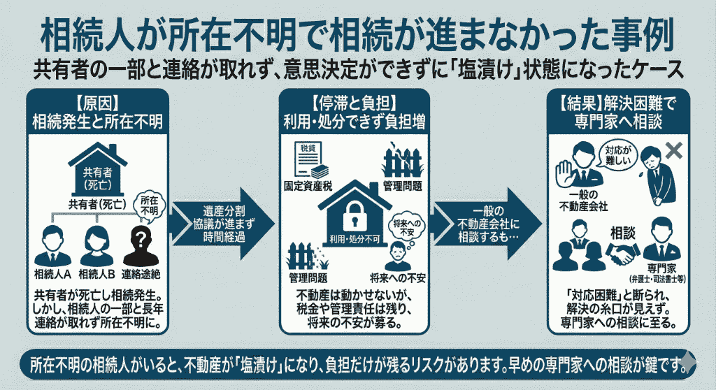 相続人の一部と連絡が取れず、相続手続きそのものが長期間止まってしまった事例です。