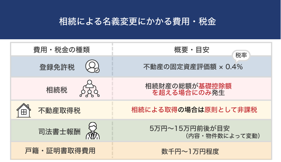 相続による名義変更で、一般的に発生する費用・税金は次のとおりです。