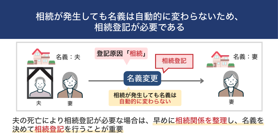 夫の死亡がきっかけで妻へ家の名義を変更する場合、登記原因は「相続」となり、相続登記を行う必要があります。この場合、「夫名義の家は当然に妻のものになる」と誤解されていることが多いのですが、実務上は自動的に名義が変わることはありません。