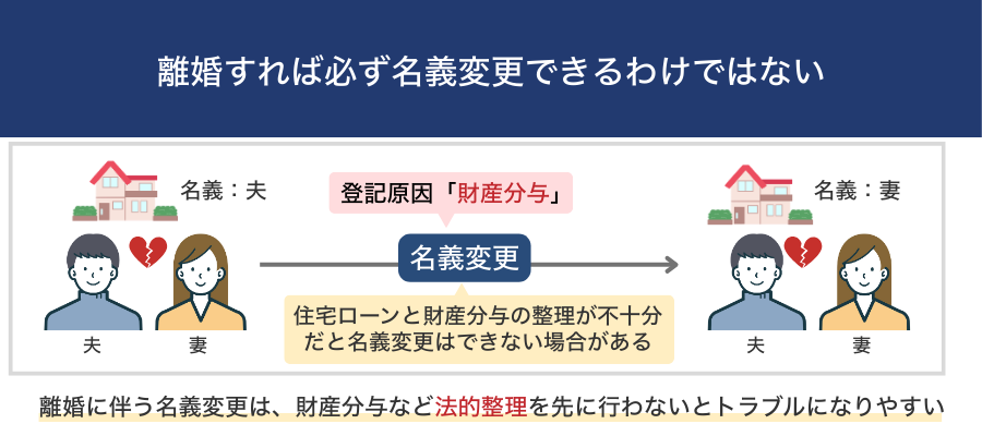 法律上は、一定の条件を満たせば財産分与として名義変更が可能ですが、実務では住宅ローンが残っていることを理由に、名義変更ができないケースが多く見られます。