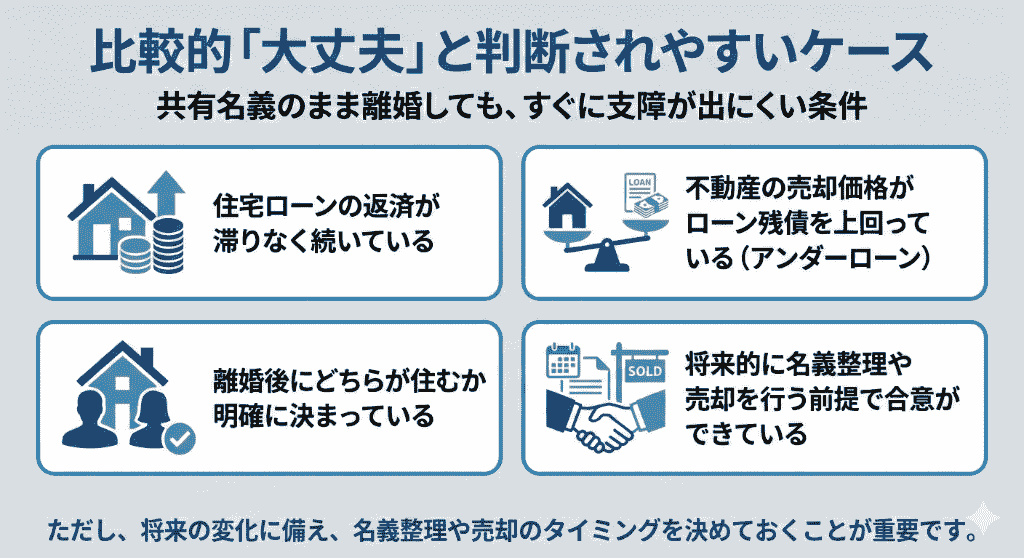 住宅ローンの返済が滞りなく続いている 不動産の売却価格がローン残債を上回っている(アンダーローン) 離婚後にどちらが住むか明確に決まっている 将来的に名義整理や売却を行う前提で合意ができている |