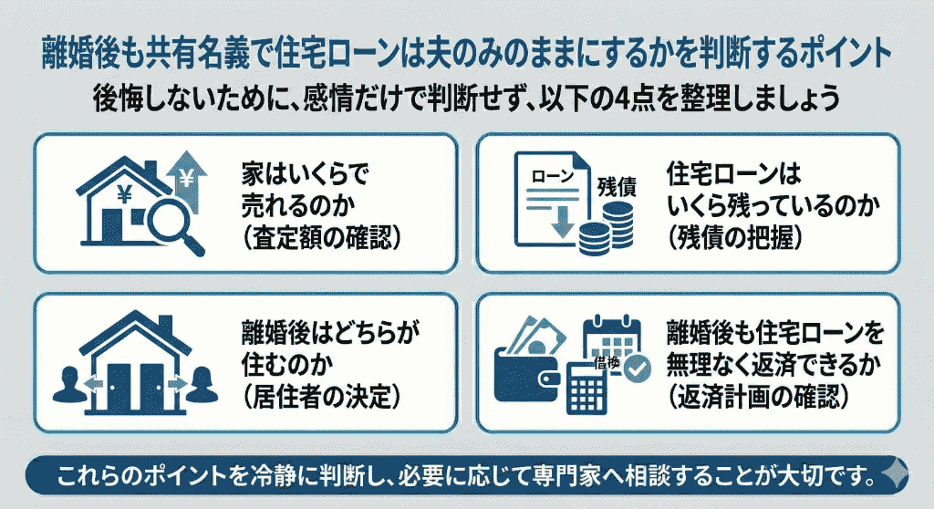 離婚後も共有名義で住宅ローンは夫のみのままにするかを判断するポイント