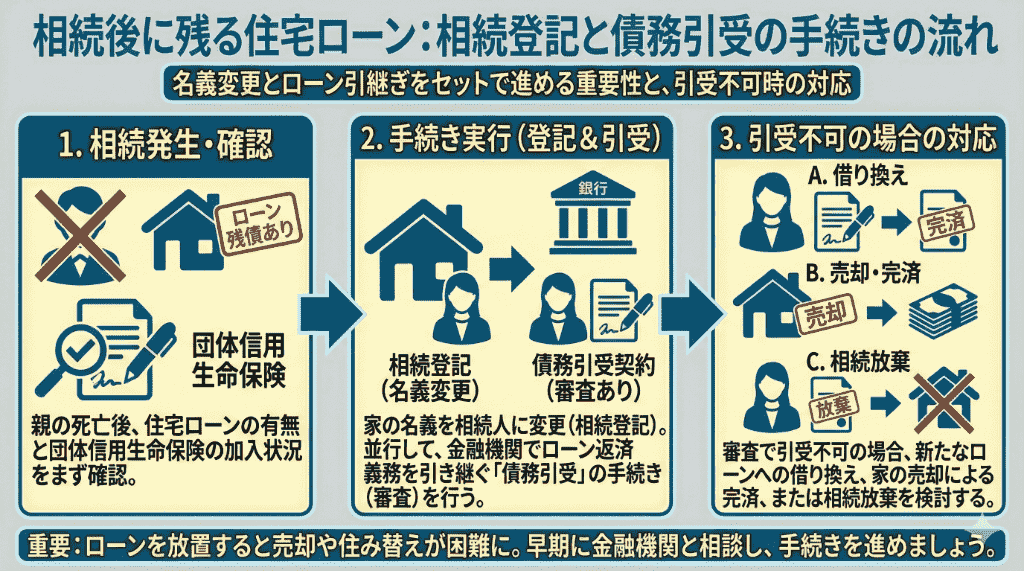 まず、家の名義を相続人に変更する相続登記を行います。そのうえで、住宅ローンが残っている場合は、金融機関で「債務引受」という手続きを行い、相続人が正式なローン返済者になる必要があります。