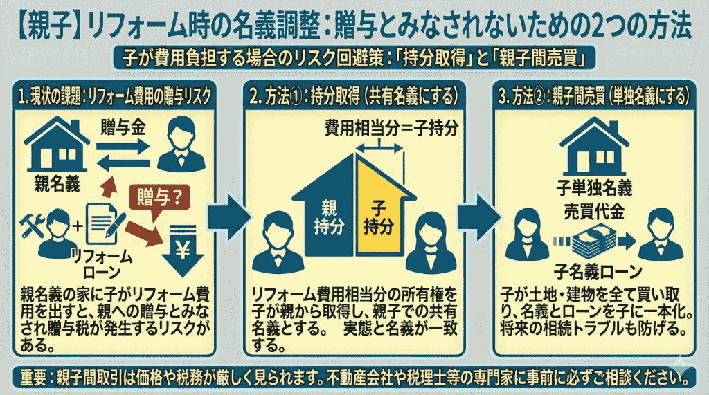- 【親子】リフォーム時は「持分取得」「親子間売買」で名義を調整する