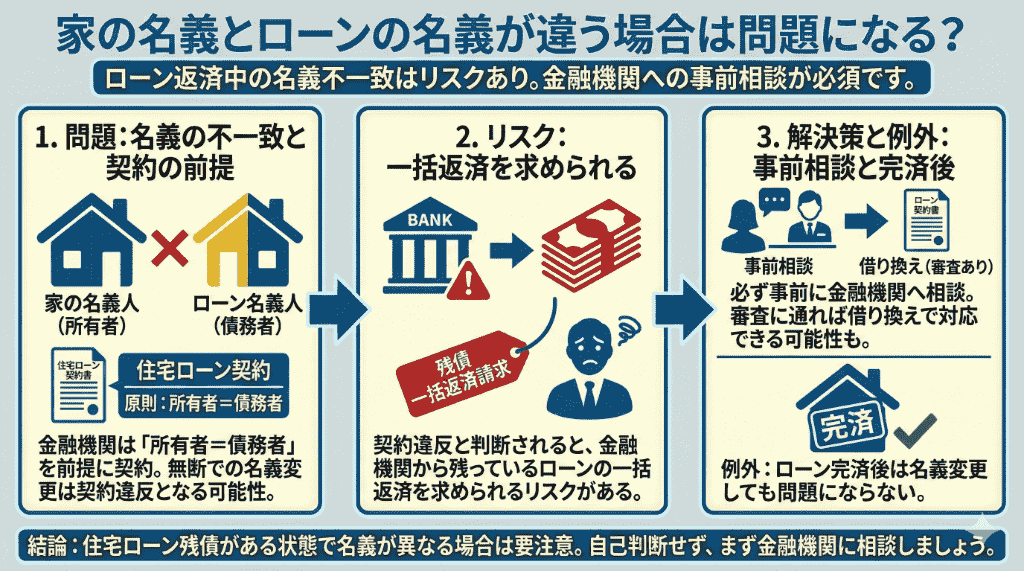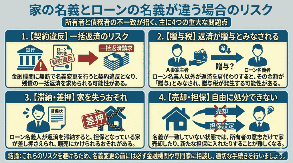 家の名義と住宅ローンの名義が違う状態を放置していると、金融機関との契約や税金、将来の売却など、さまざまな場面で不利になるリスクがあります。