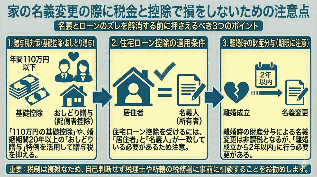 節税メリットを失わないためには、名義変更を行う前に「誰がローンを借りているのか」「誰が実際に住むのか」を整理し、家とローンの名義と居住実態が一致する形を保つことが重要です。